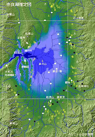 (奈良湖推定図。この図によれば、縄文遺跡は水辺、湿地帯をさけて山麓の微高地に分布しているが、弥生時代の農耕集落(唐古鍵遺跡など)は湿地帯に分布している。面白いのは古墳時代から飛鳥時代の古墳や宮殿・宮都跡は稲作生産の拠点である水辺・湿地ではなく三輪山の山辺に分布している。やがては湿地の無い盆地南の飛鳥の地に遷っている。この図はネットの図形検索で出てきた図で、あちこちのブログで引用されている。しかし、いくら調べても出典が明らかでない。以前「近畿農政局のHP」に掲載されていたものではないかと思う。作者不詳だがよく出来ているので引用させてもらった)